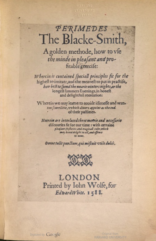 The title page of Perimedes the Blacksmith presents it as a didactic text offering exempla to be imitated: “A golden method, how to use the mind in pleasant and profitable exercise: Wherein is contained special principles fit for the highest to imitate, and the meanest to put in practice.” Greene envisioned a wide audience for his readership, from the highest class to the lowest; as he writes in his dedication to Gervase Clifton, he published this book with the classical Horatian goals to “profit” and “please” his readers. While we do not have any evidence about the early reception history of Perimedes the Blacksmith, we can only assume that Greene would be sour to learn that his book is remembered today only because he wrote about Christopher Marlowe.